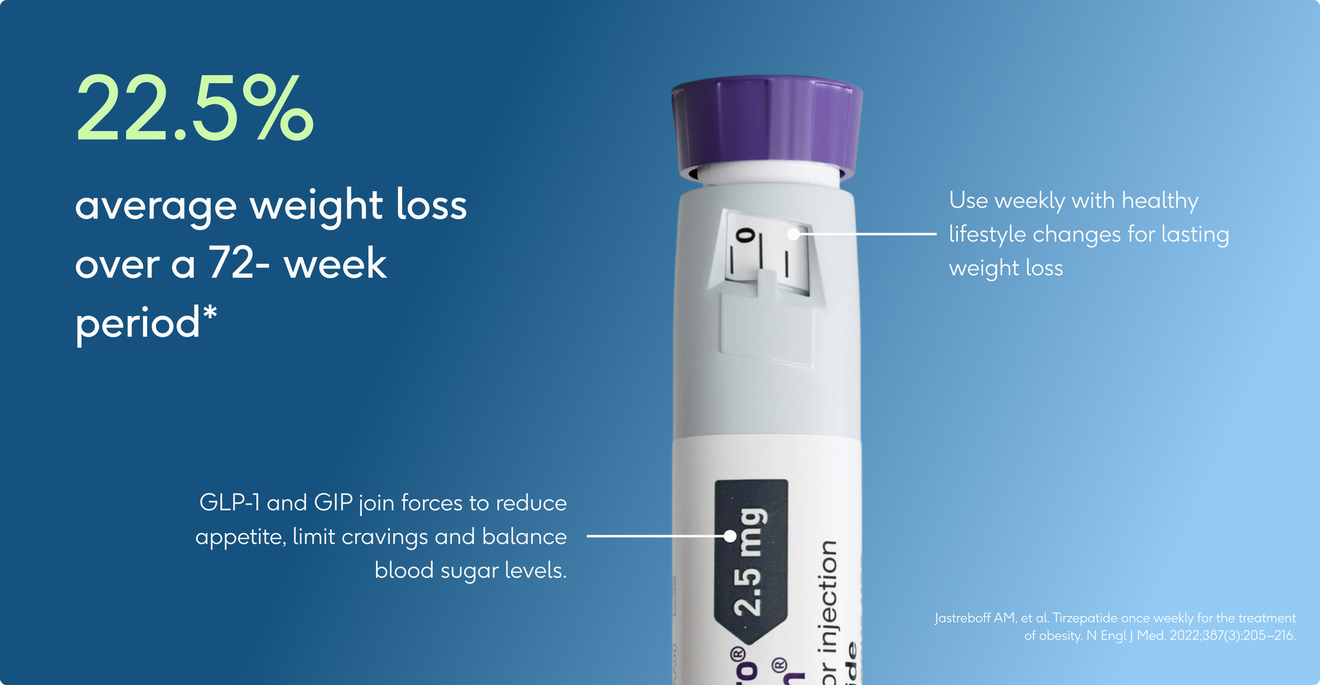 *Jastreboff, A.M., Aronne, L.J., Ahmad, N.J., Wharton, S., Connery, L., Alves, B., Kiyosue, A., Zhang, S., Liu, B., Bunck, M.C. and Stefanski, A. (2022) ‘Tirzepatide once weekly for the treatment of obesity’, New England Journal of Medicine, 387(3), pp. 205–216. doi:10.1056/NEJMoa2206038. In the SURMOUNT-1 trial, participants taking the 15mg dose lost an average of 22.5% of their body weight after 72 weeks.